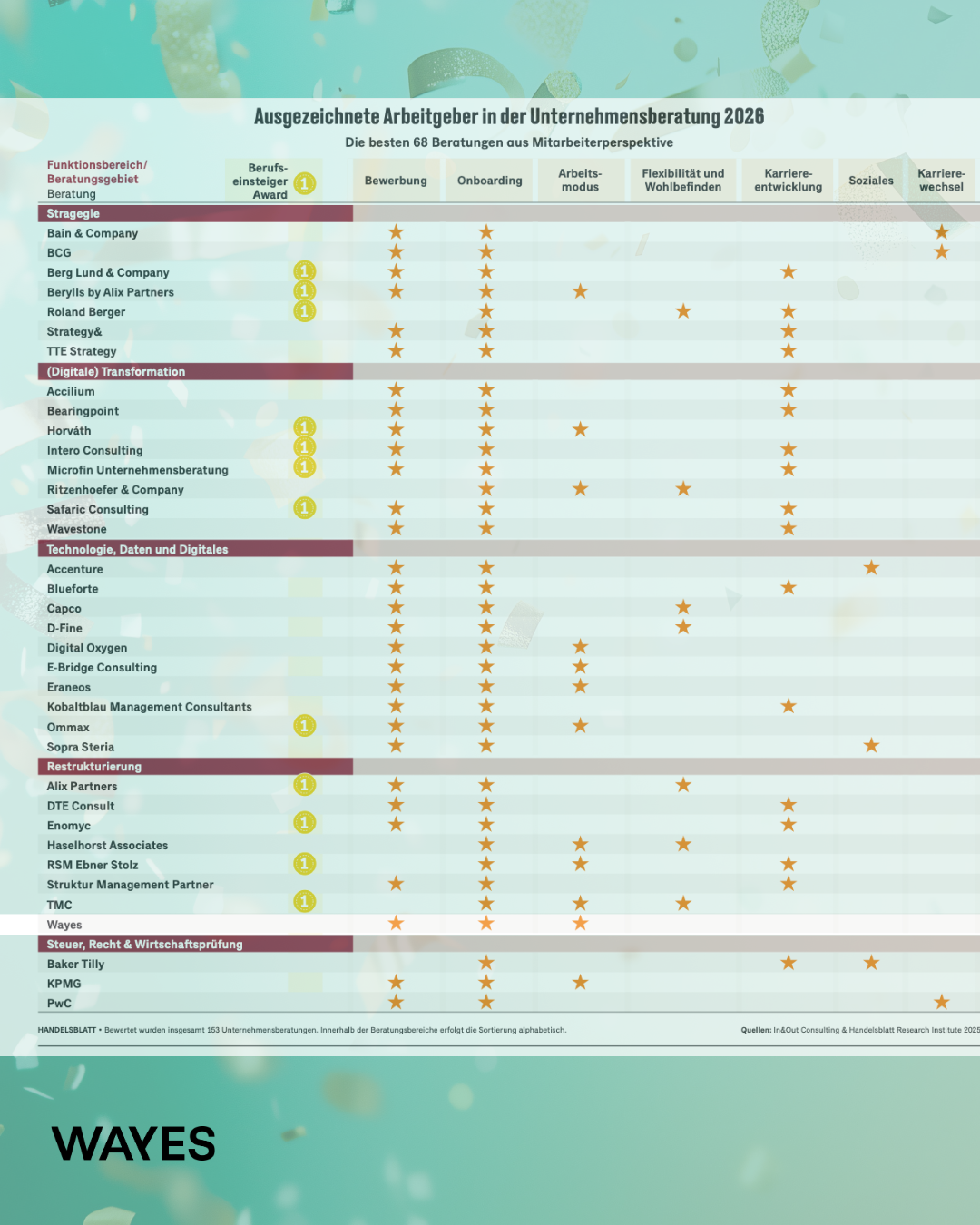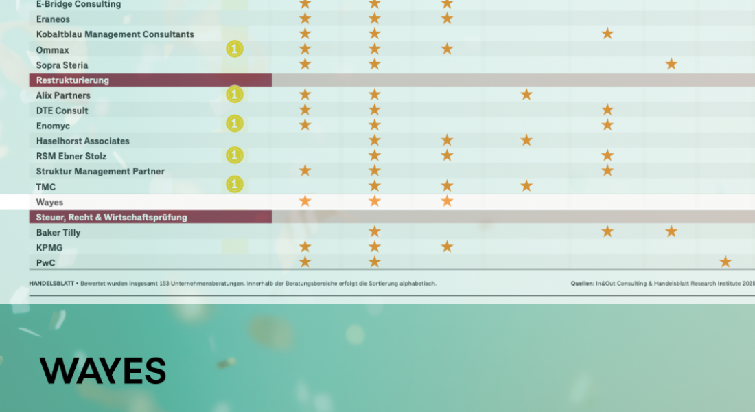 YES! Wir freuen uns sehr über diese besondere Anerkennung: WAYES wurde im Handelsblatt-Ranking „Beste Arbeitgeber Unternehmensberatung 2026“ im Bereich Restrukturierung ausgezeichnet 🏆