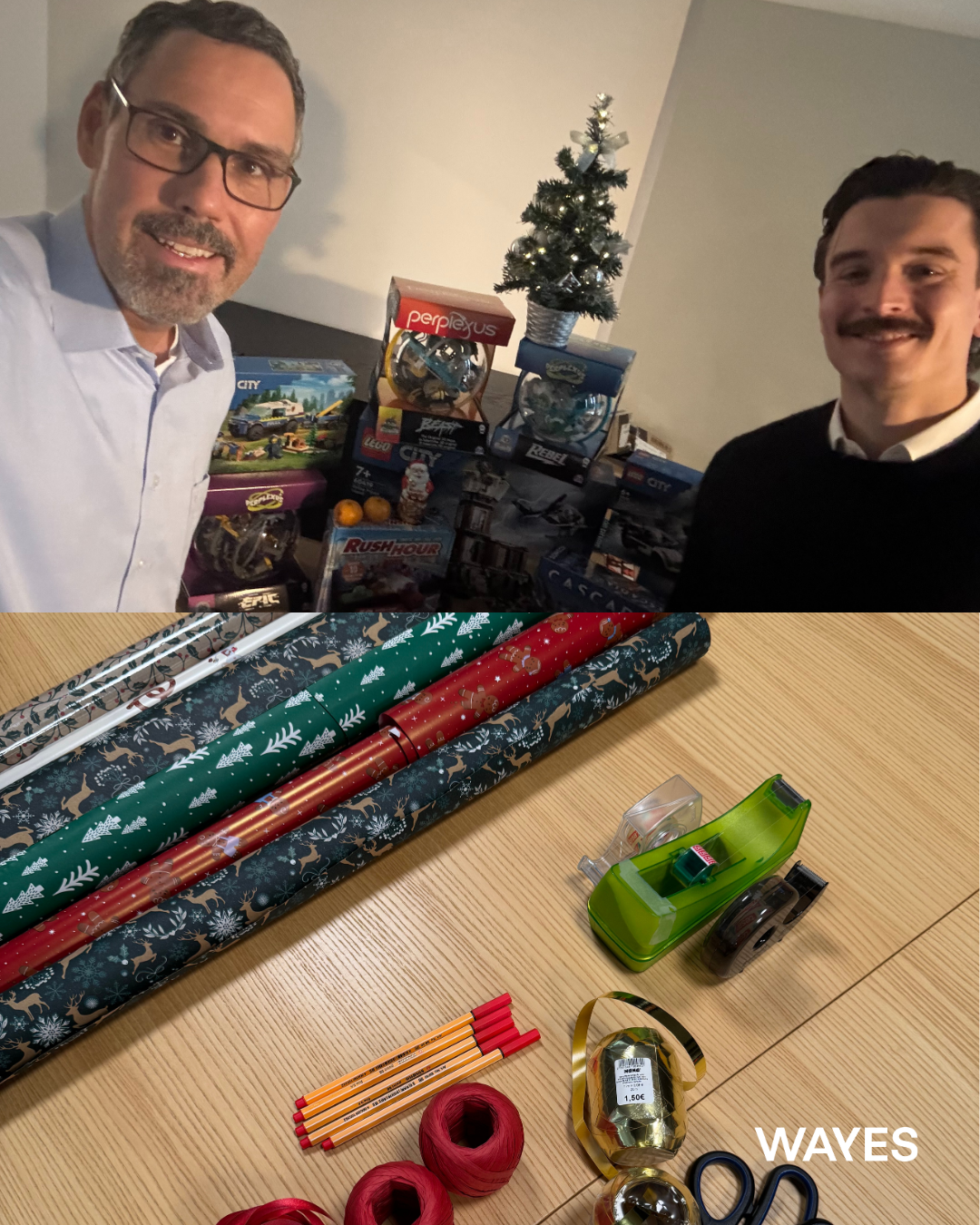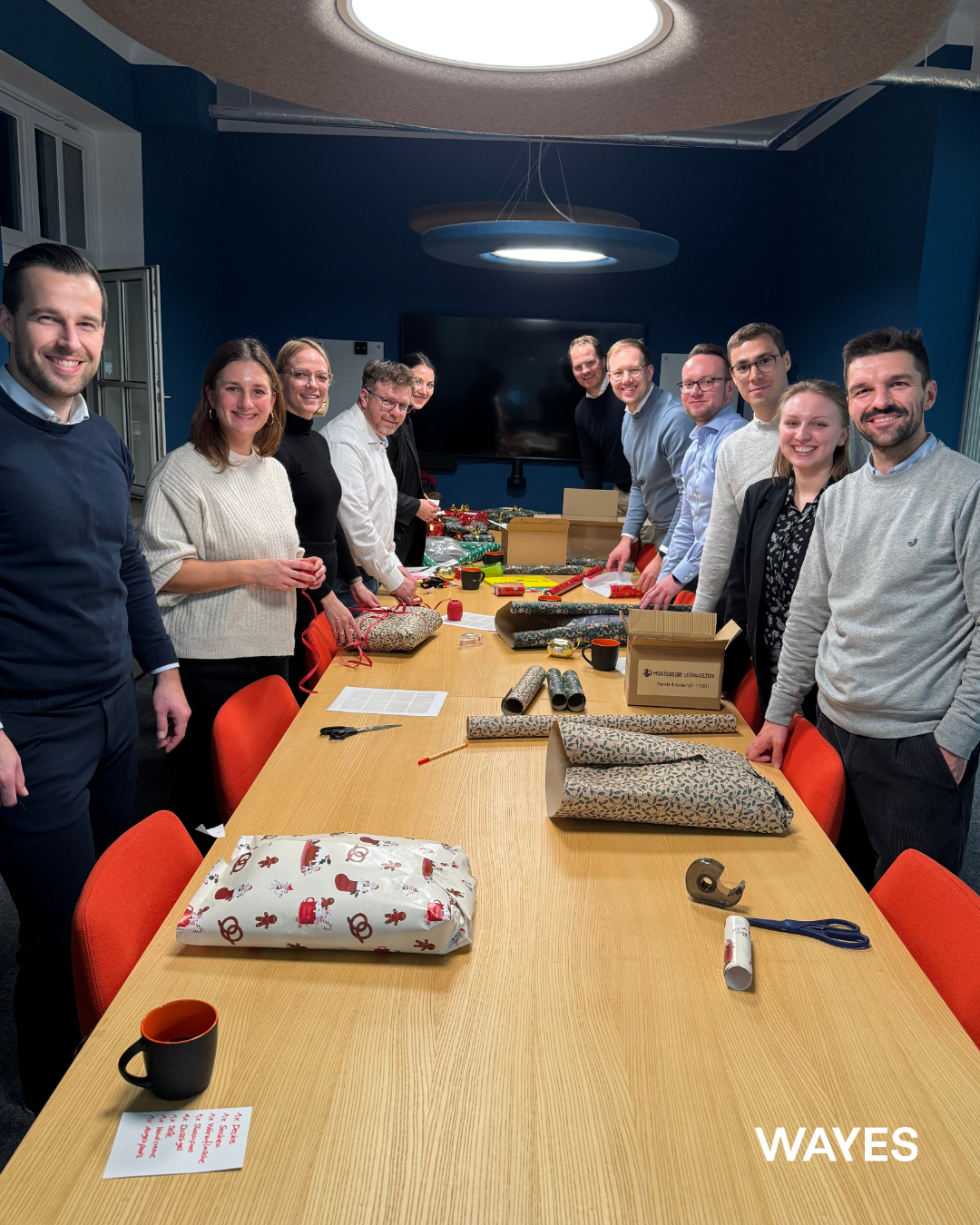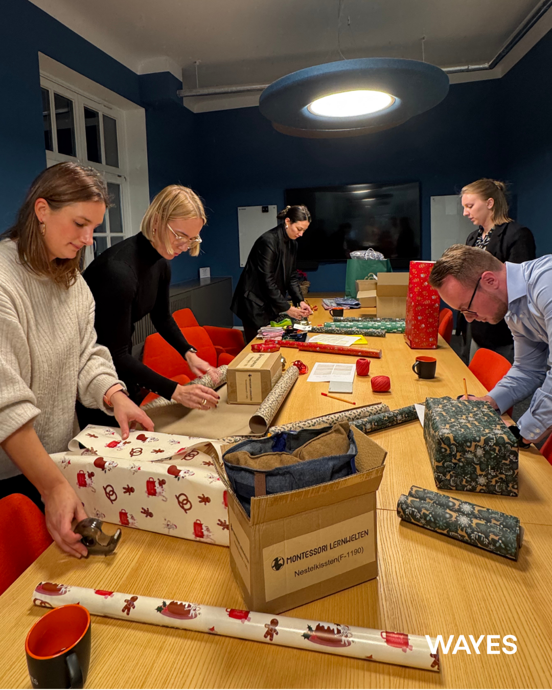 Mit den Wunschlisten im Gepäck ging es für uns los zum Einkaufen. Danach wurden unsere Büros kurzerhand zu Weihnachts-Packstudios: überall Papier, Schleifen, helfende Hände und ganz viel Herzblut. Es war einfach schön zu sehen, wie viele Kolleg:innen mitgemacht haben und wie viel Team-Energie dabei entstanden ist.