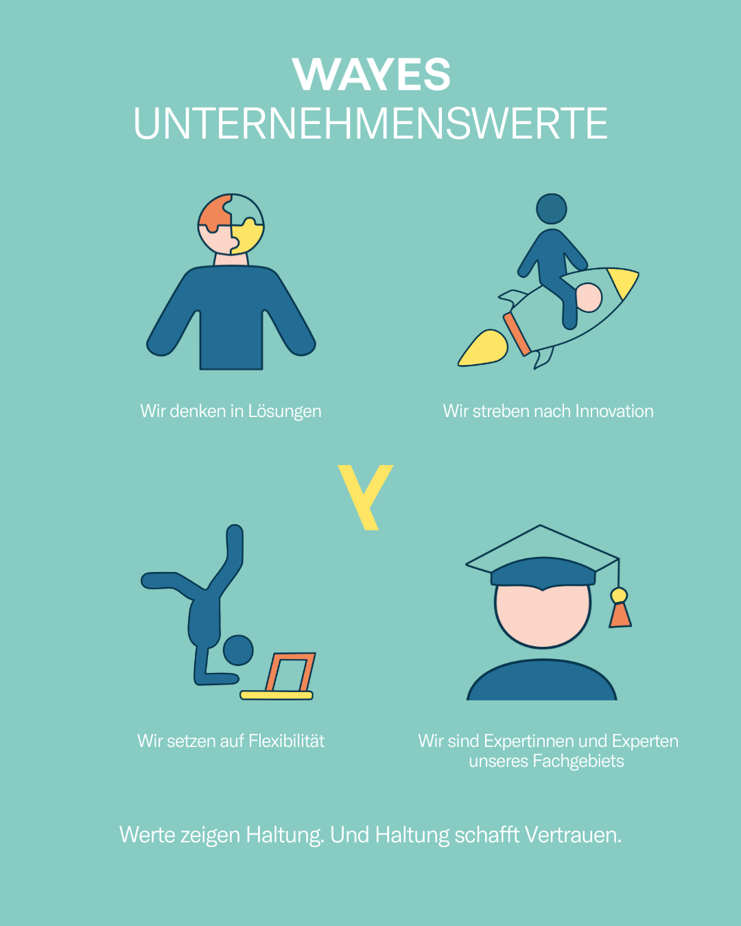 Diese Werte tragen wir bewusst nach außen. Denn sie zeigen, worauf man sich bei WAYES verlassen kann – in jedem Projekt, in jeder Begegnung, in jeder Entscheidung. Sie schaffen Identität, Differenzierung, Vertrauen und bilden damit das Fundament für langfristige, erfolgreiche Partnerschaften.